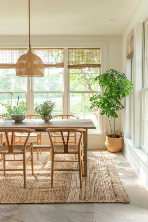 A hand -woven natural fiber carpet and a woven trailer light give the dining room warmth and texture. They not only define the space, they also introduce a touch of craftsmanship.