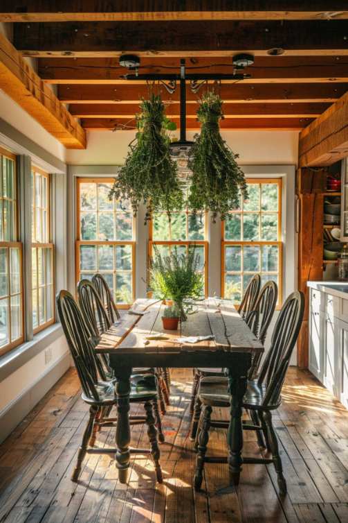 A herb drying shelf suspended from the ceiling shows Bundelel fragrant herbs. This practical yet decorative feature gives the dining room with natural scents and the CottageCore style.