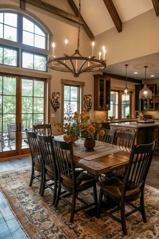 Blacksmith accents such as this chandelier give the dining room a robust and elegant touch and contrast the lighter fabrics and surfaces. These decorative elements improve the rustic charm and the timeless attraction of the room.