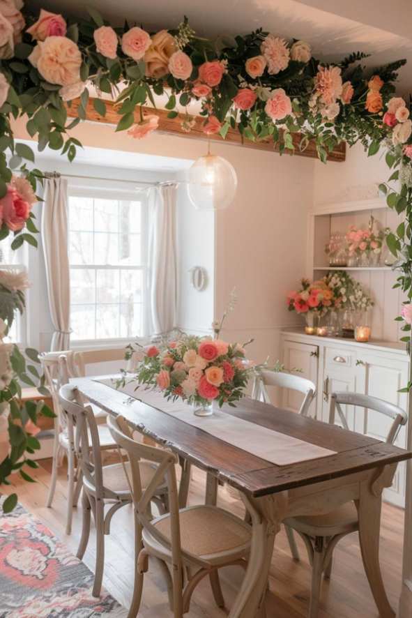 Flower garlands drap over the walls of the room and the ceiling and weave a enchanting color and fragrance magic that highlights the cottage core style of the room.