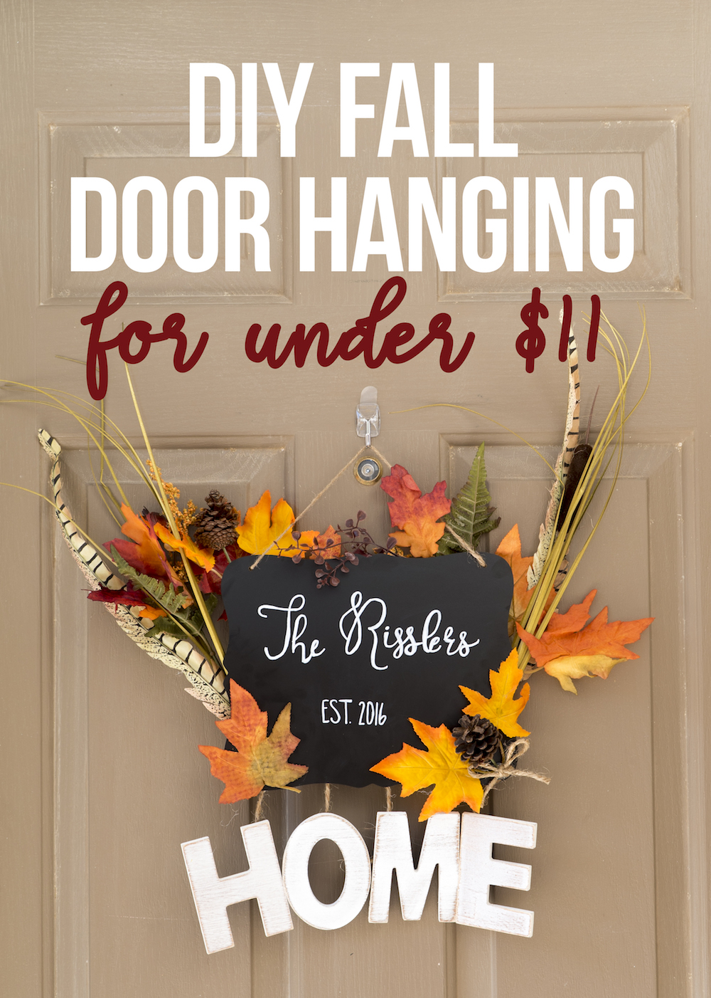 I used a Command Strip hook to hang it on the front door, but you can also use a wreath hanger or nail if you’d like!