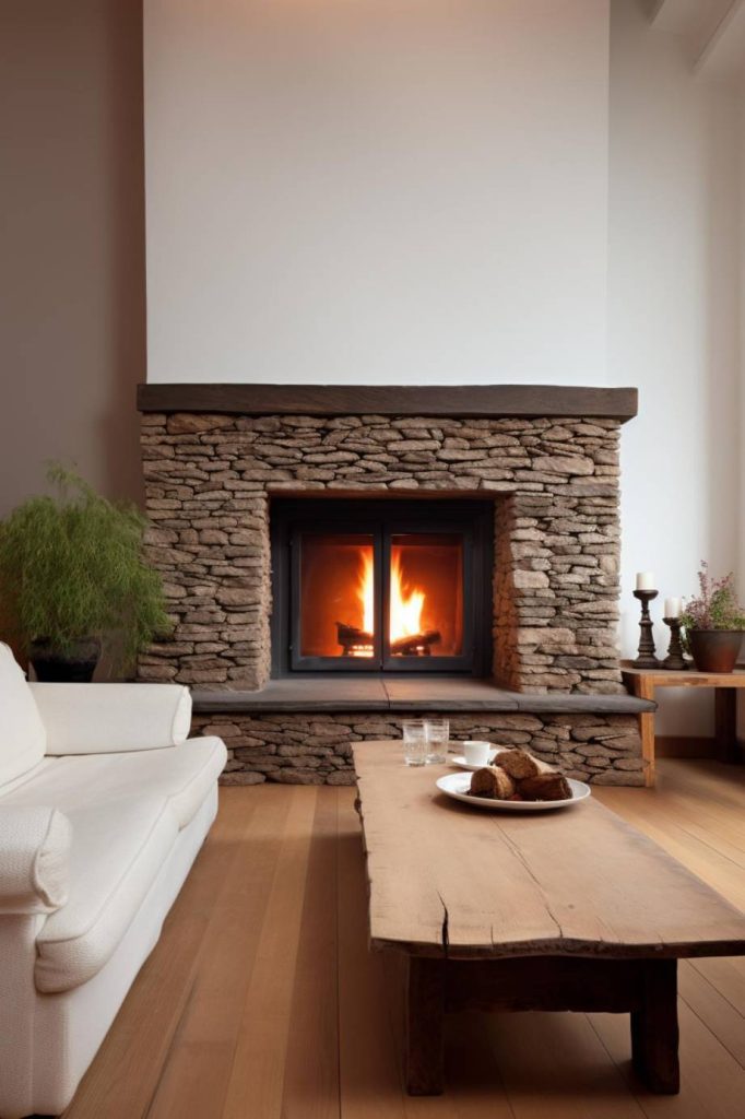 If you want something simple and minimalist, this brown, beige and white stone weathered edge fireplace is an excellent focal point for a minimalist space.