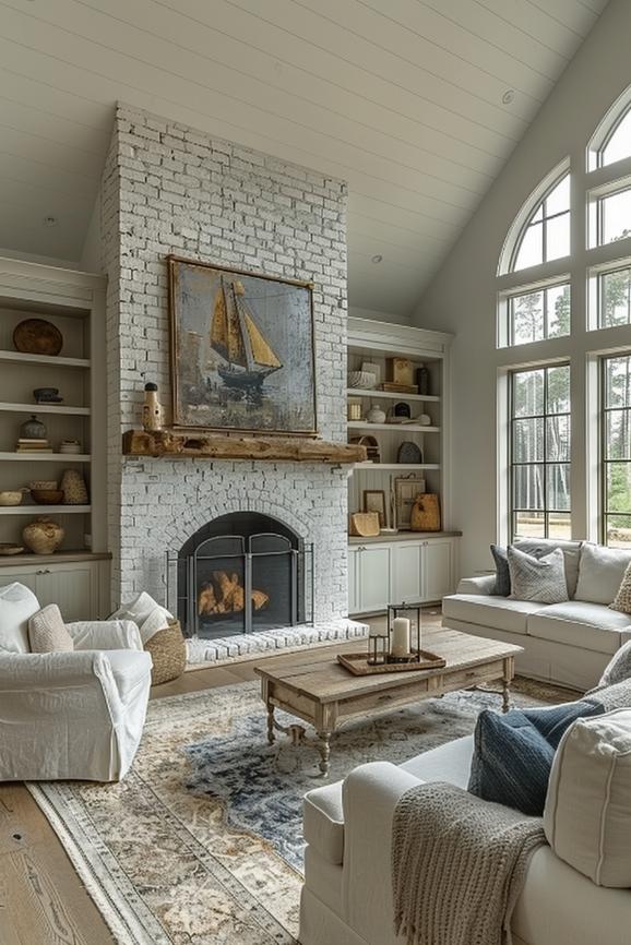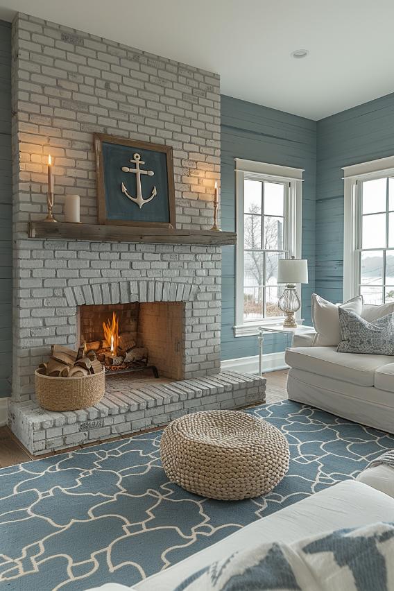 Tips from ropes and nautical topics, such as a framed anchor on this fireplace coat and Jute accents in the room, which are beautifully interweaving with the light gray bricks of this fireplace and causing the peace ability from coast Life.