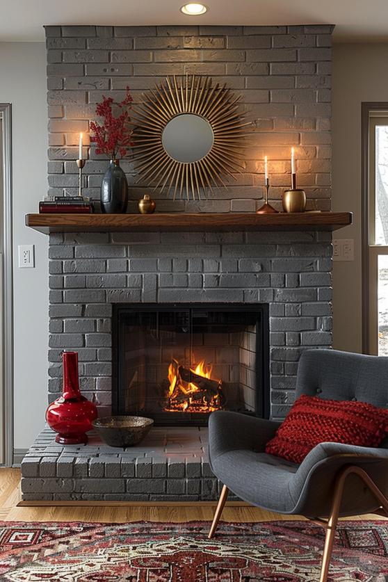 A gray brick fireplace, which is decorated with light and brave modern accents from the middle of the century, such as a dared -at -the -art mirror, golden candlesticks, a deep gray vase with red flowers and a unique, bright red vase give every living room a hint of retro – Flair.