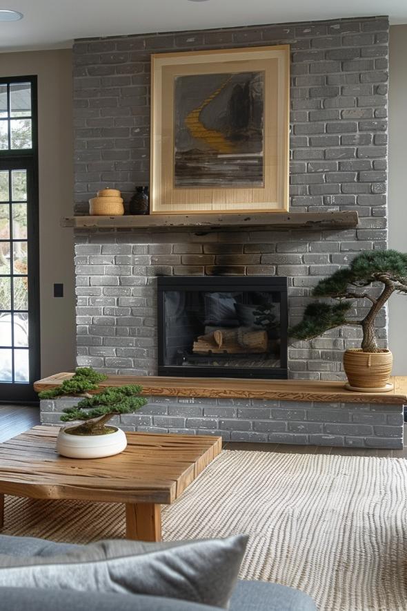 This gray brick fireplace, which is infused with Asian -inspired elements, offers a peaceful retreat for those who are looking for serenity in their room.