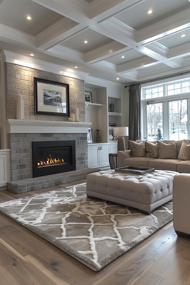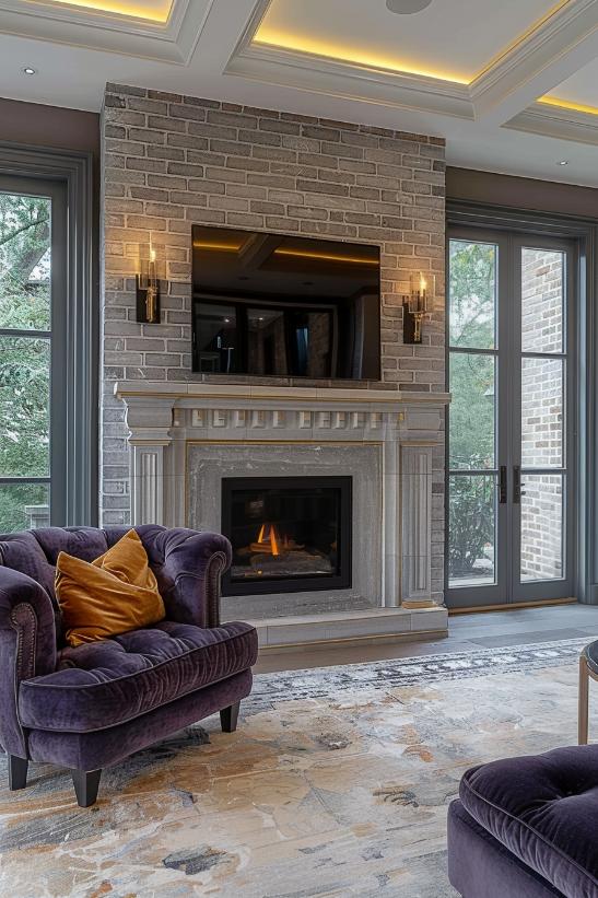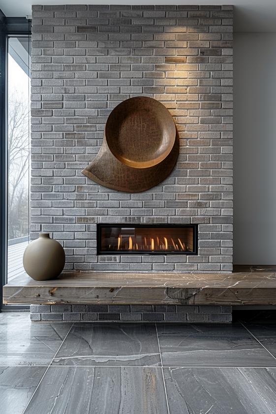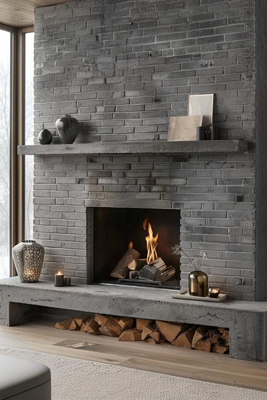 An elegant gray brick fireplace is the epitome of modern minimalism in this living room, with its unadorned surface offers a chic, reserved elegance.