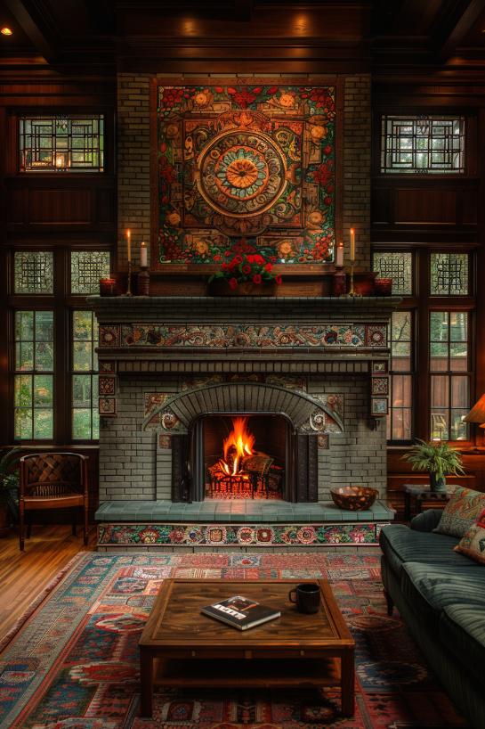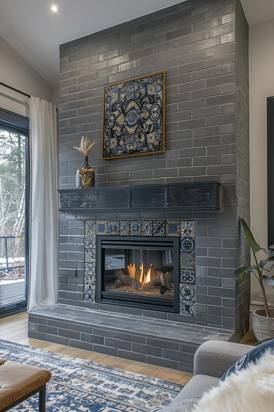 Unique Art Deco-Inspired Decor in the living room and the flowers of vegetables and flowers complement the gray bricks of this fireplace and deliver a retro and yet timeless visual festival.