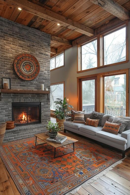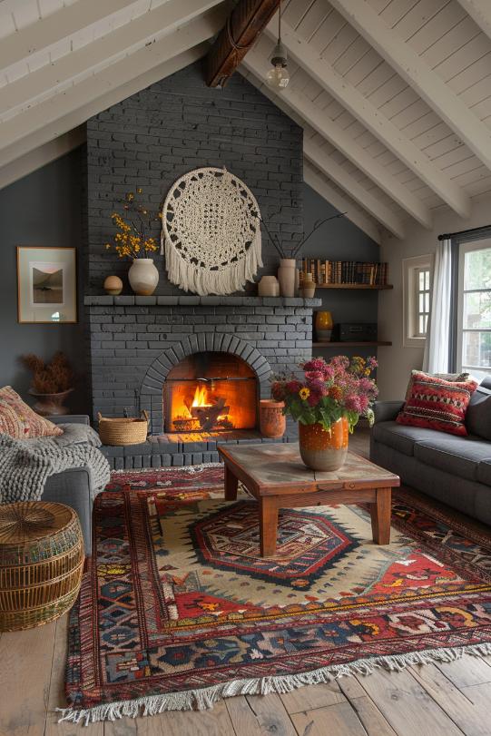 This gray brick fireplace is emphasized into a focal point in a space inspired by Boho, which hangs on a macramé wall, rattan baskets and neutral-colored vases with light-colored flowers.
