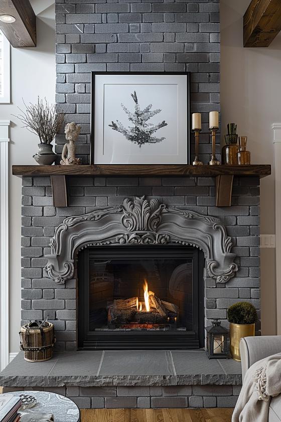 Classic details dress up this elzectical gray brick fireplace with a golden decor, framed pictures and pot vegetables and transform it into an elegant piece of statement in a similarly decorated room.