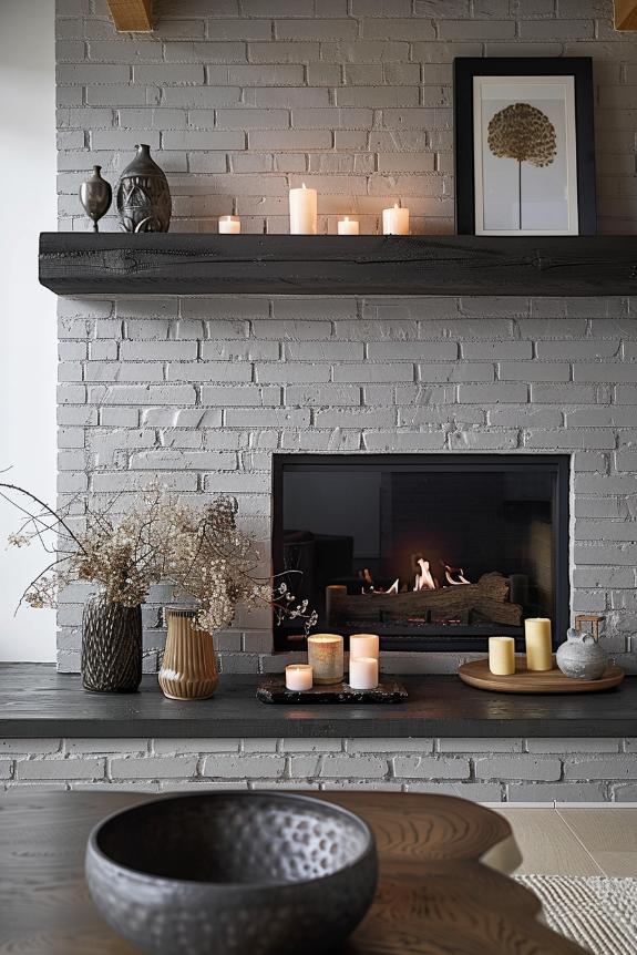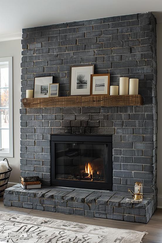 Go brave and dramatically with a dark gray, gray -dependent fireplace, which is broken with a natural wooden coat, in which several decorative elements such as framed photos of different sizes and a series of white candles belong in different lengths.