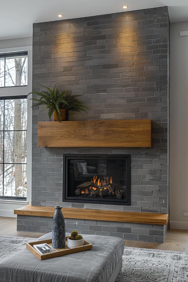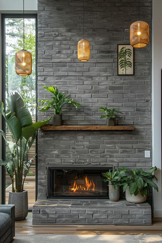 Experience the warm hug of Hygge with a Nordic modern gray brick fireplace and a wooden coat with simple ferns and, despite the cool tones, offer a cozy sanctuary from the cold.