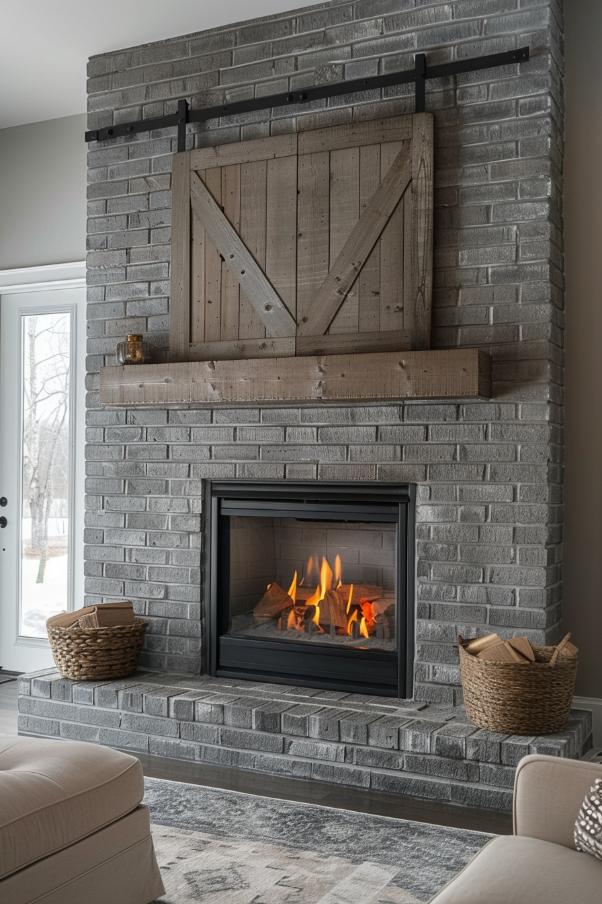 The modern farmhouse aesthetics seems in this fireplace Barn on the fireplace for a touch of rustic charm.
