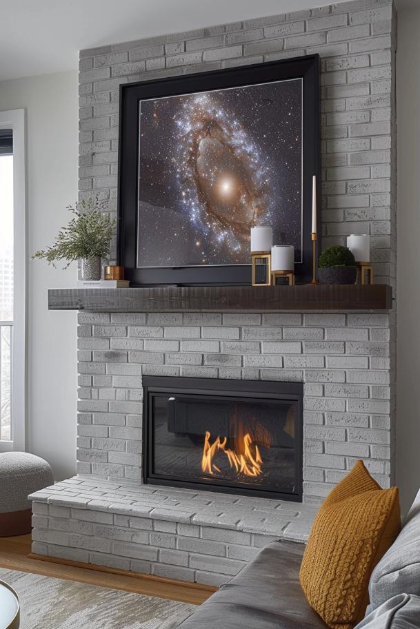 A galaxy painting in a black frame gives this simple gray brick fireplace an extraordinary look that is ideal for the forward -thinking decorator. Surrounding this with the glow of candles and the softness of living greens.