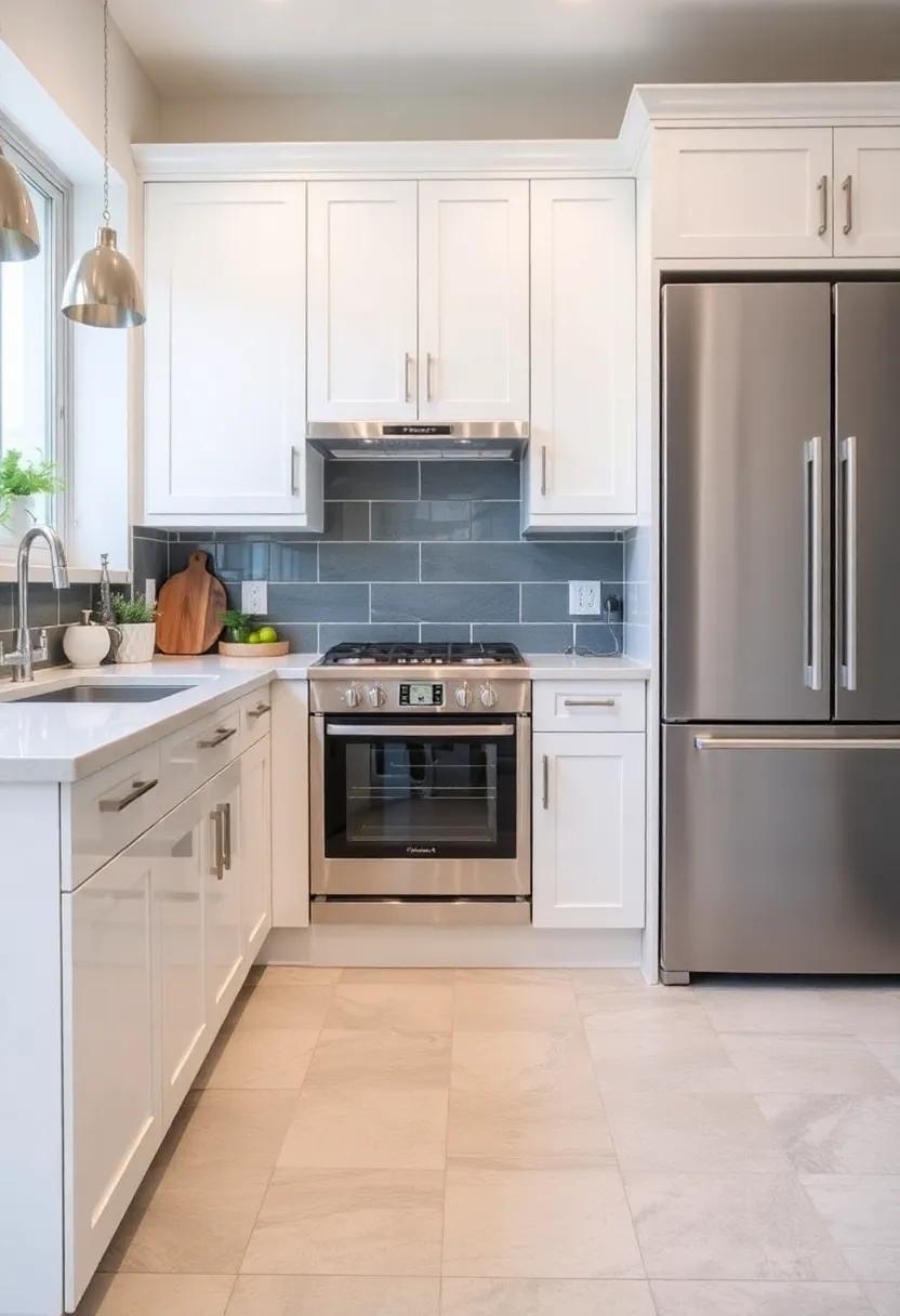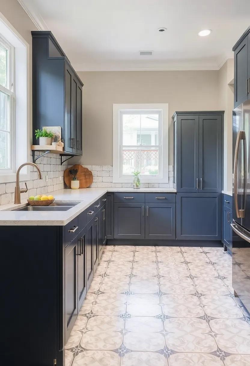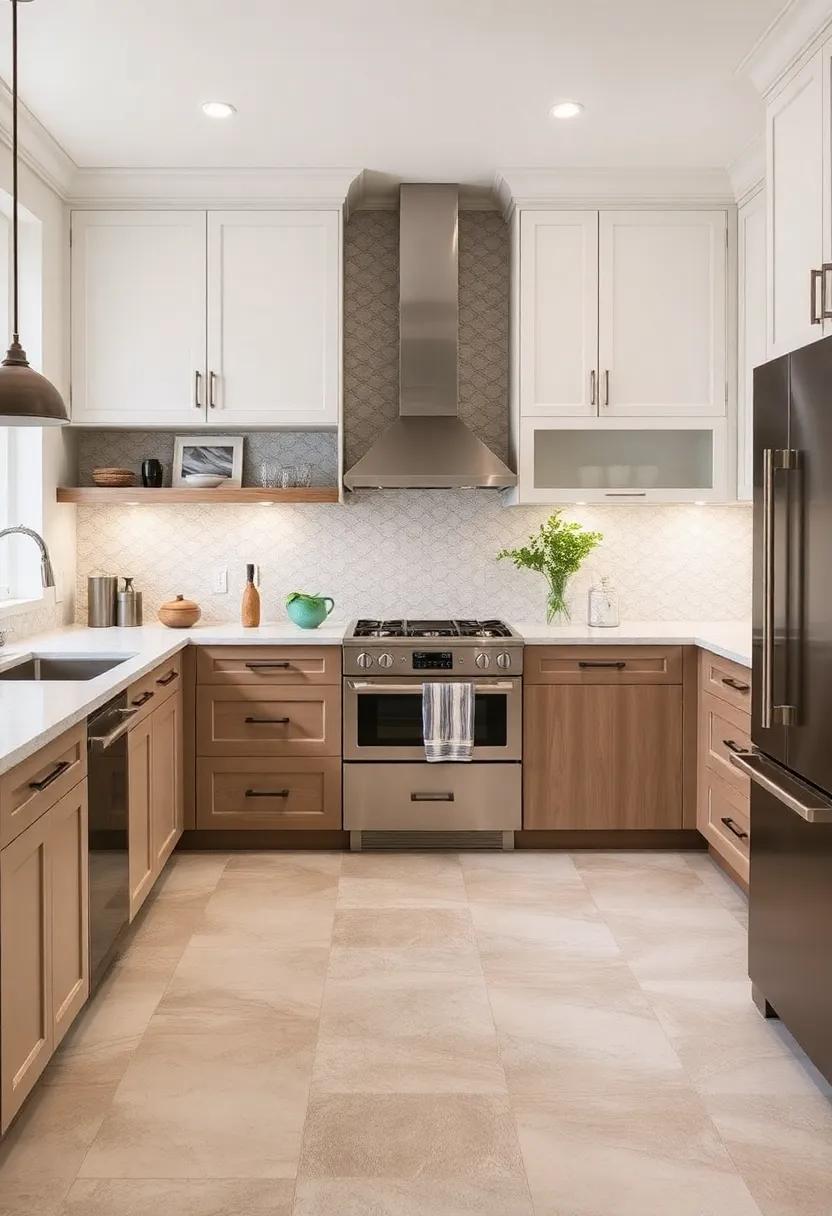 Additionally, incorporating a patterned tile border or creating a focal point with a unique tile design can add visual interest to your kitchen while also drawing the eye to certain areas, making the space feel more dynamic and thoughtfully designed.
