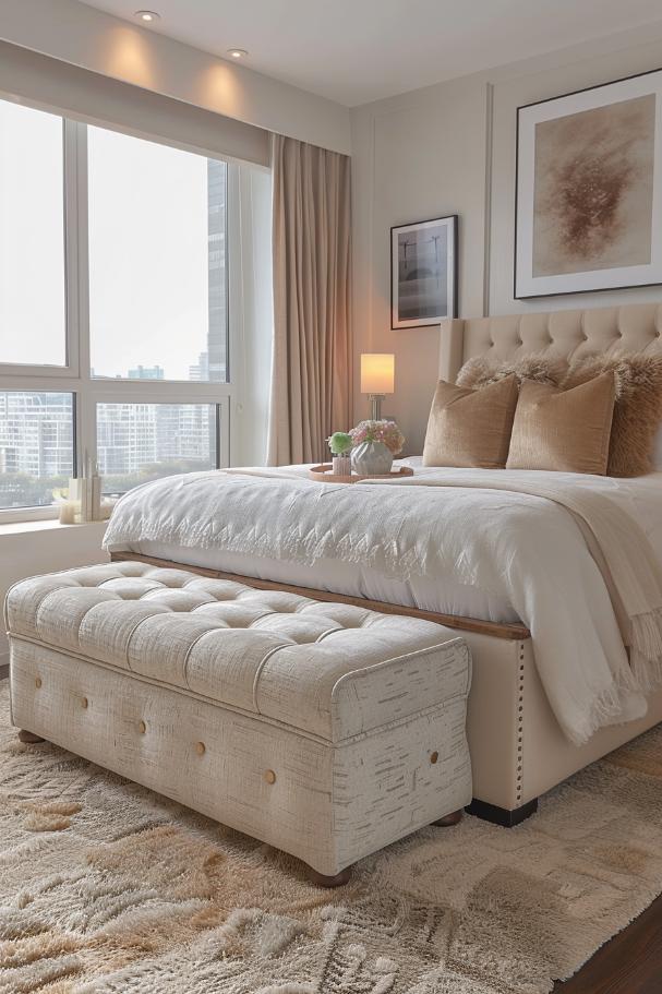 A chic, white -fragrant footboard bench serves as a warehouse that is embedded in a small bedroom at the end of the bed and balances the function with style.