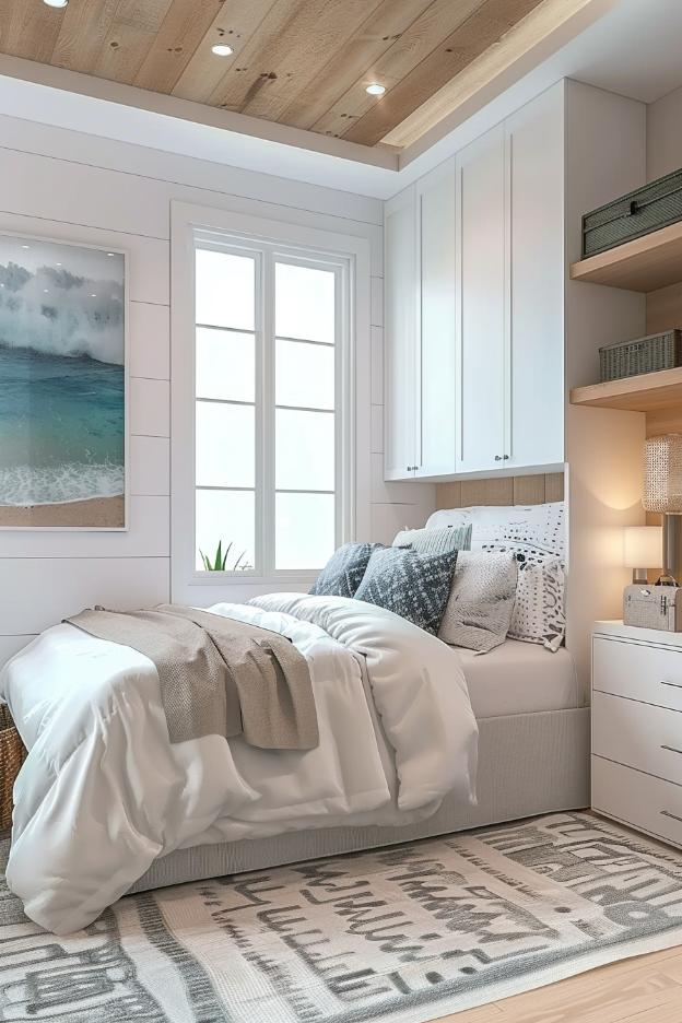 Take a vacation in your little bedroom. A touch of salted air finds its way into this Bedroom with coastal motifWith crispy white colors that spray through the intimate space through a few blues and gray tones.