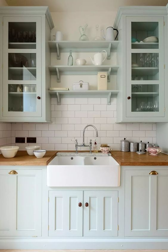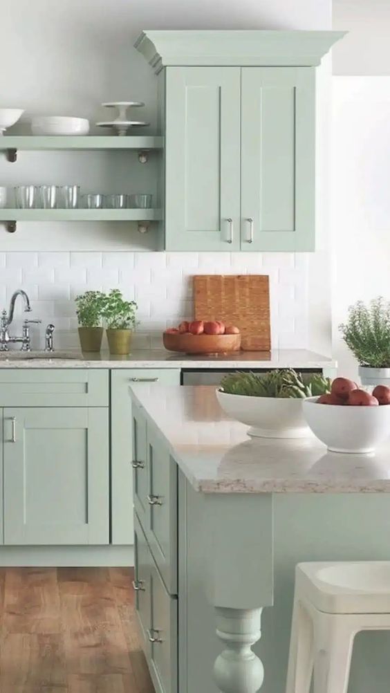 In a white and mint green kitchen, open shelving can help to showcase your beautiful dishware and accessories, adding a touch of charm and personality to the space. The combination of white and mint green is refreshing and soothing, perfect for creating a calming atmosphere in your kitchen.